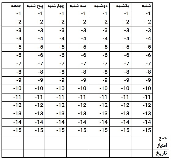 لطفا هر روز بمدت یکهفته تست را انجام داده و امتیاز هر سوال را در جدول زیر بنویسید و در انتها جمع آنرا بنویسید .