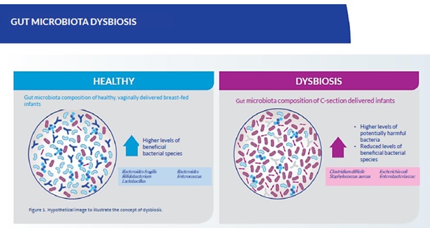 ترکیب میکروبیوتای روده نوزادان سزارین شده که کاهش سطح گونه های باکتری مفید و سطوح بالاتر باکتری های بالقوه مضر شامل :