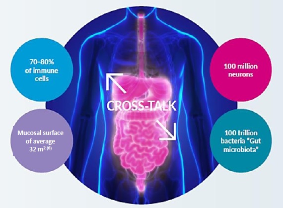 70-80% سلول های ایمنی و 100 میلیون نورون عصبی و سطح مخاطی با میانگین 32 متر مربع و 100 تریلیون باکتری در روده وجود دارد .