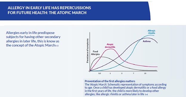 Atopic March به ما می گوید که اگر کودک در ابتدای زندگی دچار درماتیت آتوپیک یا آلرژی غذایی شود ، در مراحل بعدی زندگی می تواند به رینیت آلرژیک یا آسم تبدیل شود .